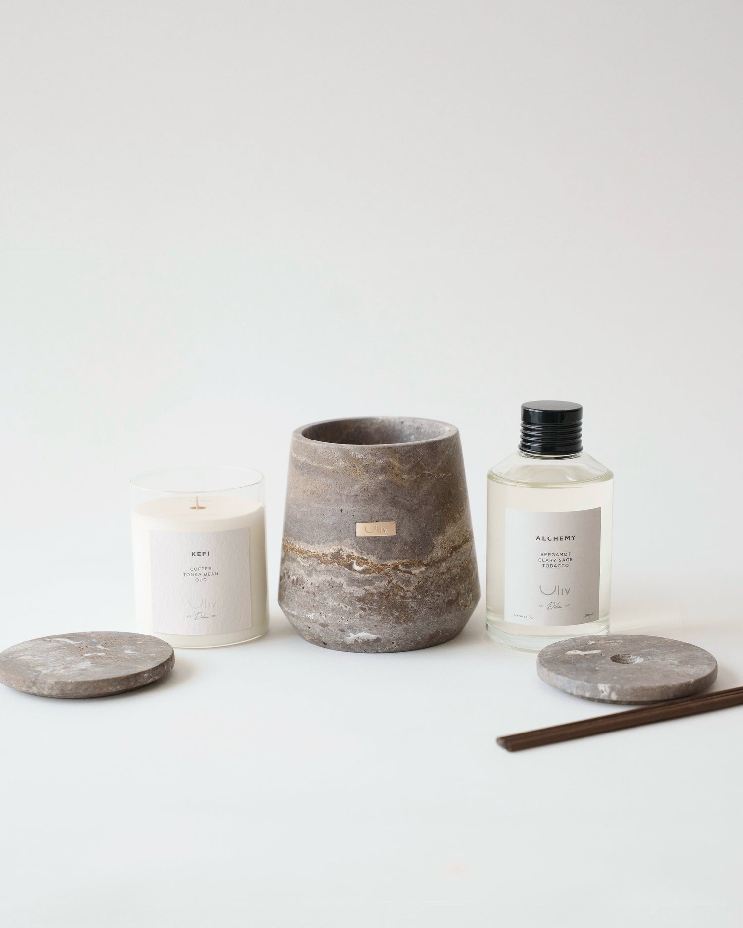 Each stone vessel is carved from natural marble or travertine, refillable by design and can be used as either a candle or a diffuser. Just switch the lid, choose your scent, and make it your own.