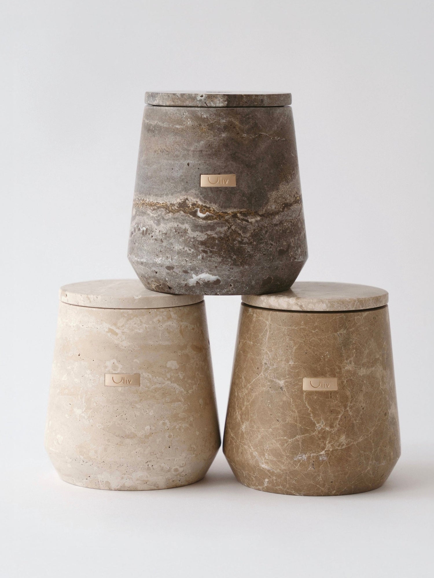 Each stone vessel is carved from natural marble or travertine, refillable by design and can be used as either a candle or a diffuser. Just switch the lid, choose your scent, and make it your own.
