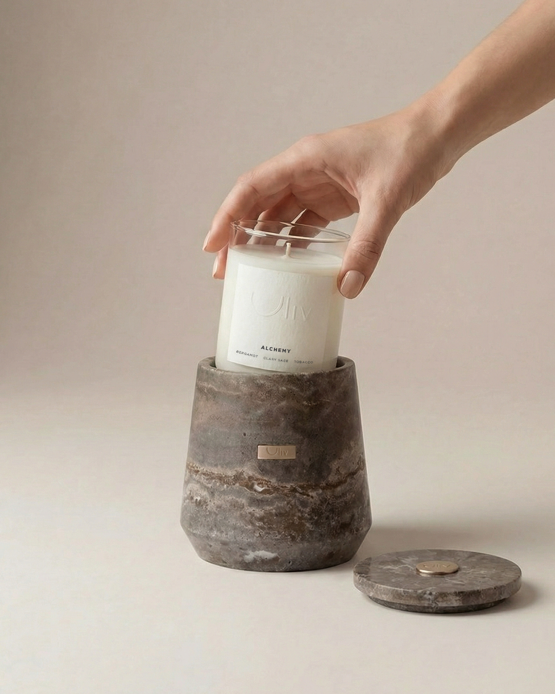 Each stone vessel is carved from natural marble or travertine, refillable by design and can be used as either a candle or a diffuser.