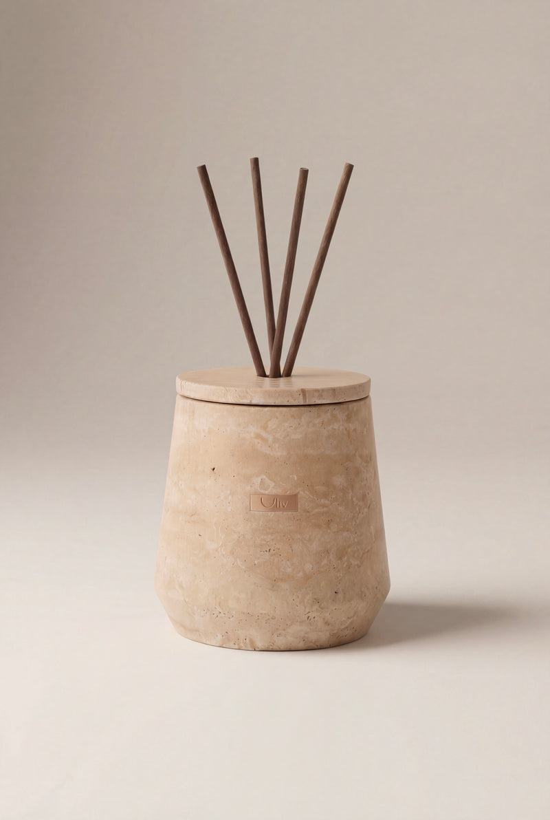 The Dune is simplicity in its purest form. Carved from beige travertine, each piece has its own natural markings. Solid, weighty, cut from real stone. On a coffee table, by your bed, or holding something small and personal, it will be a beautiful touch to your home. Choose your favourite scent from our diffuser oils, blended with high-quality fragrances sourced from Italy. The Dune comes with a set of brown reed sticks.